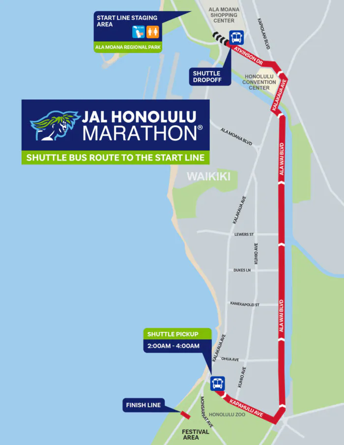 There are complimentary shuttles running from the Honolulu Zoo to the Start from 2 AM – 4 AM. Board early and don’t wait for the last shuttle as there may not be room for you.